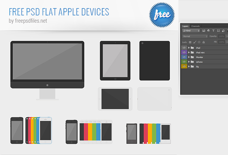 Descarga de forma gratuita un set en Photoshop de los distintos dispositivos de apple con estilo plano o flat design que podrás utilizar en tus diseños.